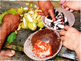 Urucú nome Amazônia. Não é um fruto comestível, o homem Amazônico utiliza para usar cores para pintar e decorar os seus trabalhos materiais, bem como as suas roupas, suas casas, canoas, e também usado para pintar o rosto como um sol, quando as sementes ou achiote Urucu seca é utilizada como uma refeição, para dar cor a massa ou macarrão. Paxiuba. Da madeira utiliza-se para a elaboração de arcos para usar as flechas com eficacia. Da raiz se usa para fazer una forte bebida afrodizíaca para fortalecer a potência sexual. A raiz em contato com pele humana reativa o sentido do plazer e a motivação sexual. A palmera do Açaí: A fruta se extrae um suco de cor escuro apropiado para terapia de anemias agudas no ser humano da árvore se extrai o famoso palmito, uma verdura muito rica em proteínas para manter uma alimentação saudavel. De sua raiz se faz um chá, também apropiado para prevenir doenças sanguineas. A palmeira de açaí. Das frutas sucos muito ricos em vitamina ferro adequado para tratamento de anemia, anemia grave pode estar a preparar um chá da raiz, bem como o coração da árvore palmito é extraído vegetais amplamente utilizado na dieta alimentar. Ayahuasca.Alucinogéca bebida a base de plantas que motivam uma sugestão mental para separar o espírito do corpo e fazer uma espécie de viagem astral durante o transe. Bebidas